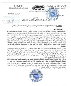 وبناء على ذلك ، فإن المكتب الإقليمي للجامعة الوطنية للصحة المنضوية تحت لواء الاتحاد المغربي للشغل ،أبلغ مدير المستشفى للامريم بمراسلة شديدة اللهجة ، بتاريخ 2023/11/02 المسجلة تحت رقم2023/11/27 _ ، حيث جاء نص المراسلة كالتالي :