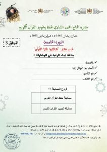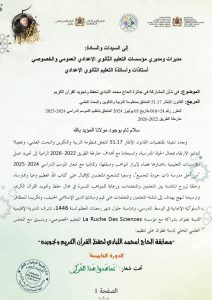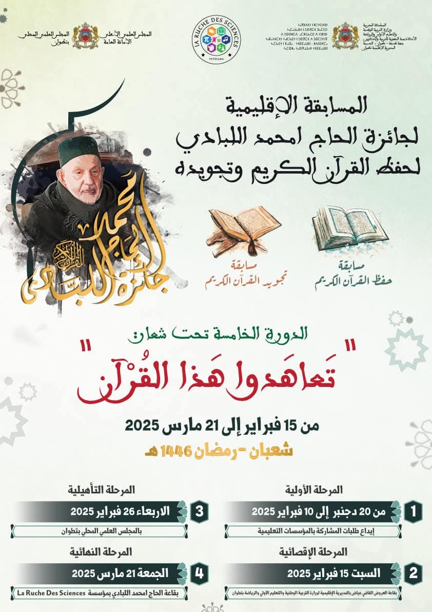 تنزيلا لمُقتضيات القانون الإطار 51.17، وانسجاما مع أهداف خارطة الطريق 2022-2026 الرامية إلى تجويد عمل المؤسسات التعليمية باعتبارها فضاءً لإبراز المواهب وصقلها، وتماشيا مع شعار الموسم الدراسي 2024-2025 “من أجل مدرسة ذات جودة للجميع”، وبمناسبة شهر رمضان المبارك لسنة 1446 هـ، تُنظم مؤسسة La Ruche Des Sciences 🏫 بشراكة مع المديرية الإقليمية لوزارة التربية الوطنية والتعليم الأولي والرياضة بتطوان، والمجلس العلمي المحلي بتطوان الدورة الخامسة لجائزة: