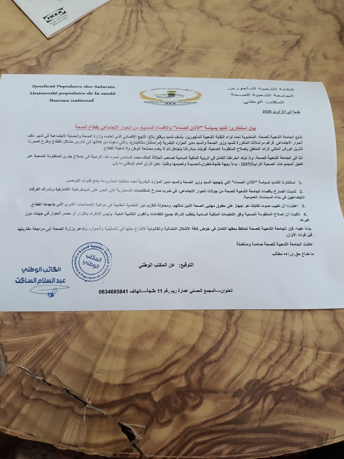 وفي هذا السياق، عبرت الجامعة الشعبية للصحة عن رفضها القاطع لإقصائها من جولات الحوار الاجتماعي، معتبرة ذلك خرقًا واضحًا لمبادئ الديمقراطية التشاركية، ومحاولة لتقزيم دور التعددية النقابية في مواكبة الإصلاحات الكبرى التي يعرفها القطاع.