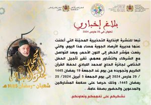 شاركها فيسبوك تويتر لينكدإن بينتيريست البريد الإلكتروني بلاغ إخباري يتعلق بتأجيل الحفل الختامي لجائزة الحاج امحمد اللبادي لحفظ القرآن الكريم وتجويده المنظمة من طرف مؤسسة la Ruche Des Sciences و المجلس العلمي المحلي بتطوان و المديرية الإقليمية للتعليم بتطوان. نسأل الله السلامة للجميع 🙏