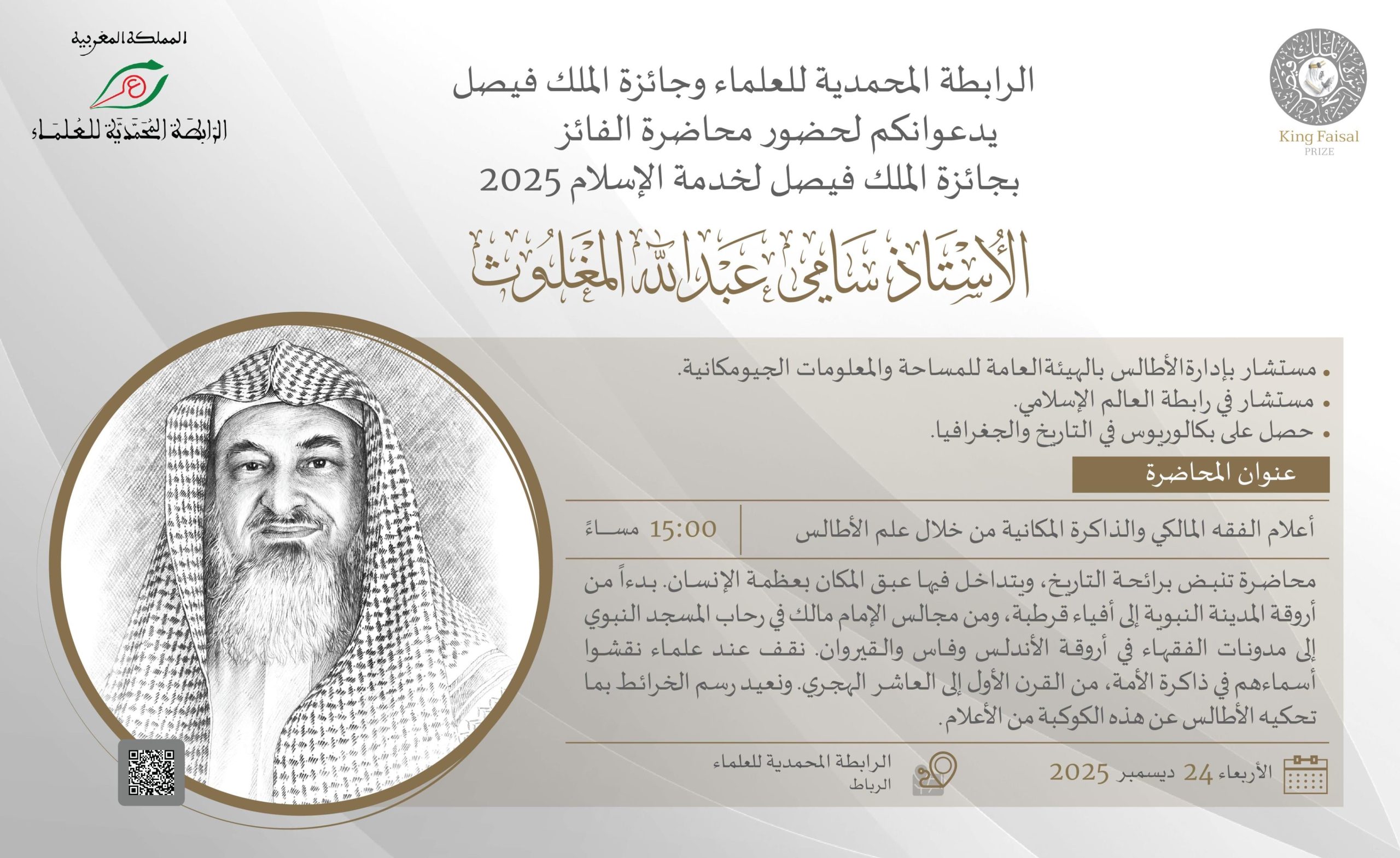 تنظم جائزة الملك فيصل، بالتعاون مع الرابطة المحمدية للعلماء بالمملكة المغربية، مساء يوم غد الأربعاء 24 ديسمبر 2025، في مقر الرابطة بالعاصمة الرباط، محاضرة علمية بعنوان “أعلام الفقه المالكي والذاكرة المكانية من خلال علم الأطالس”.