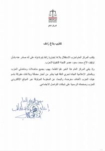 كذب المركز العام لحزب الاستقلال بلاغا إخباريا زائفا تم تداوله على أنه صادر عنه بشأن توقيف محمد سعود عضو اللجنة التنفيذية للحزب.