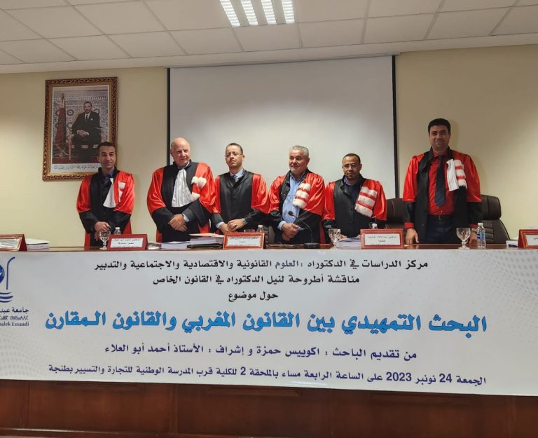 عرفت قاعة الندوات بالملحقة الأولى لكلية الحقوق بطنجة يومه 24/11/2023 مناقشة أطروحة الدكتوراه في الحقوق تخصص قانون خاص في موضوع البحث التمهيدي بين القانون المغربي والقانون المقارن ، حيث تشكلت الجنة العلمية للمناقشة من الأستاذ عبد الله أفقير اشركي رئيسا والاستاذ احمد أبوالعلاء مشرفا والأستاذ عبد الاله المحبوب عضوا والأستاذ بلال المويني عضوا والأستاذ عبد اللطيف الكلعي عضوا والأستاذة صفاء لزاري عضوة.