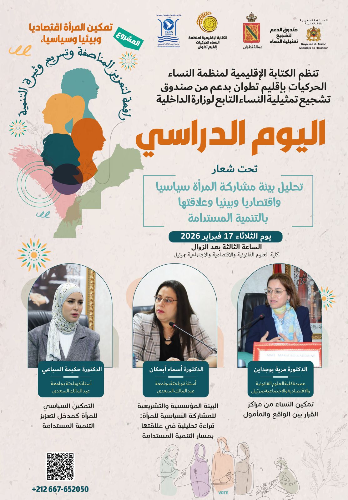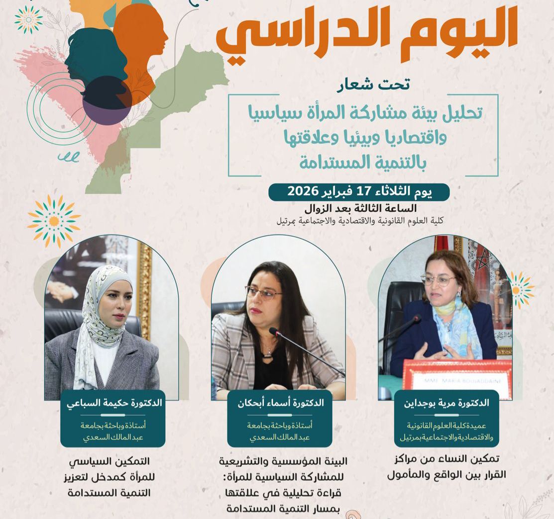 تستعد كلية العلوم القانونية والاقتصادية والاجتماعية بمرتيل، التابعة لـجامعة عبد المالك السعدي، لاحتضان يوم دراسي يوم الثلاثاء القادم، حول موضوع “تحليل بيئة المشاركة السياسية للمرأة وعلاقتها بالتنمية المستدامة”، في مبادرة أكاديمية تروم تعميق النقاش حول واقع وآفاق تمكين النساء من مراكز القرار، وتعزيز أدوارهن في تحقيق الحكامة الجيدة والتنمية الشاملة.