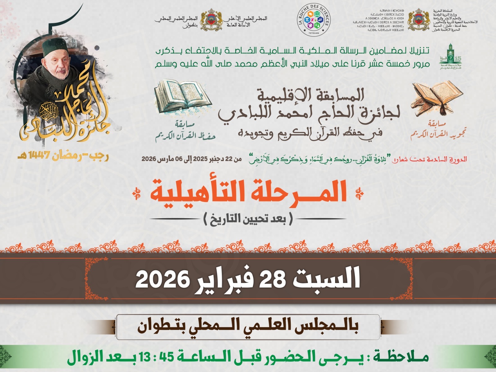 احتضنت قاعة المجلس العلمي المحلي بتطوان، زوال يوم السبت 10 رمضان 1447 هـ الموافق لـ28 فبراير 2026، فعاليات المرحلة التأهيلية للدورة السادسة من “جائزة الحاج امحمد اللبادي لحفظ القرآن الكريم وتجويده”، في أجواء إيمانية مهيبة وحضور تربوي وازن.