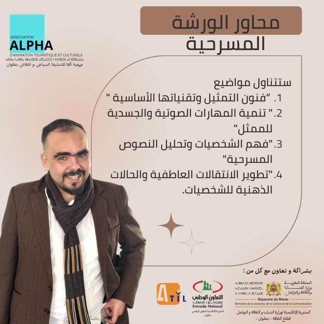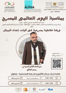 بمناسبة اليوم العالمي للمسرح، تستعد جمعية ألفا للتنشيط السياحي والثقافي بتطوان لإطلاق فعاليات ورشة تفاعلية مسرحية مميزة، بالشراكة مع المديرية الإقليمية لوزارة الشباب والثقافة والتواصل، ومندوبية التعاون الوطني، بهدف تعزيز المواهب الفنية وتنمية المهارات في المسرح. ستُقام الورشة في يومي 27 و28 مارس 2024، بمركب التأهيل الاجتماعي بطابولة بتطوان.