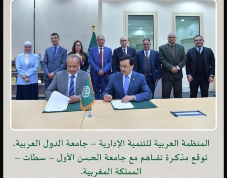 وفي أولى محطات الزيارة، عقد الوفد اجتماعاً موسعاً بمقر المنظمة العربية للتنمية الإدارية التابعة لجامعة الدول العربية، انتهى بتوقيع مذكرة تفاهم استراتيجية بين الجانبين، وقعها رئيس الجامعة والمدير العام للمنظمة الدكتور ناصر الهتلان القحطاني.